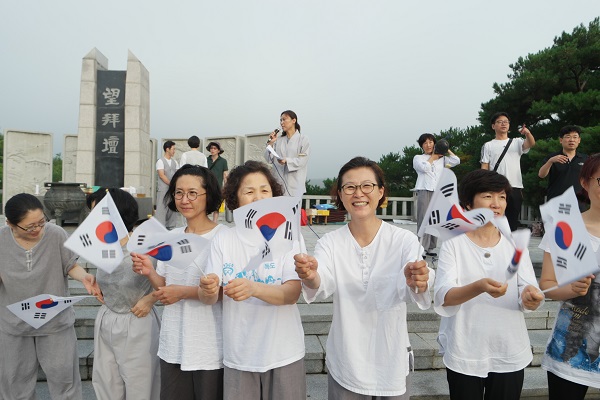 300배 정진을 마치고 도반들과 태극기를 손에 쥡니다.