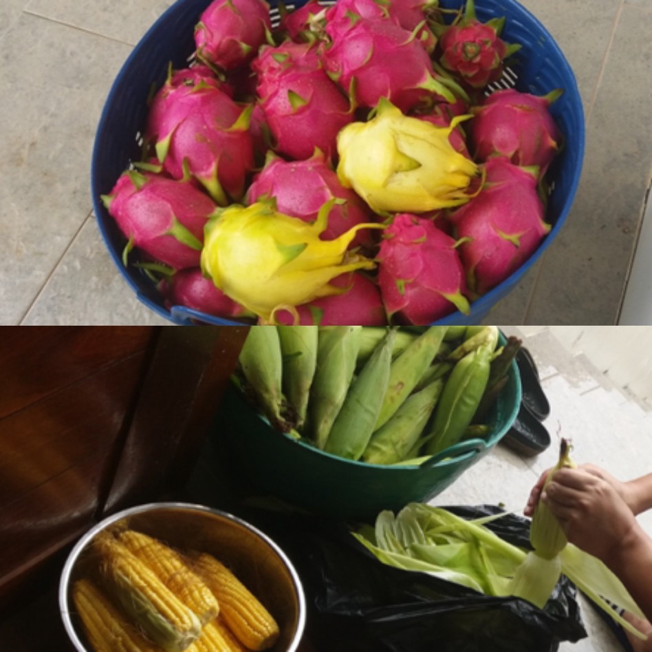 준비된 차량에 나누어 타고 두시간 반을 달려 방콕법당 총무 소임을 맡고 있는 황소연 님의 망고 과수원에 도착했습니다. 과수원이 자리한 ‘팍청’은 방콕 북서쪽 카오야이 국립공원 자락에 위치하고 있어 경관이 수려하고 공기가 무척 깨끗해 태국의 알프스로 불리는 지역입니다. 미리 도착해 있던 황소연님 부부는 일행의 간식으로 밭에서 금방 수확한 옥수수를 삶아 주었습니다.
