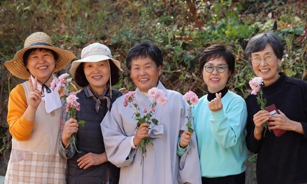 ▲ 2024년 가을 죽림정사, 김해지회 도반들과(오른쪽 두 번째 김영희 님)