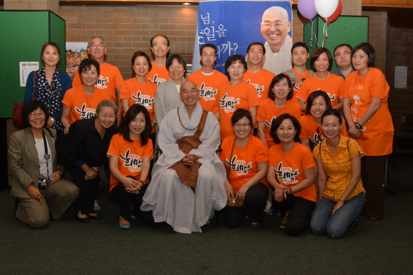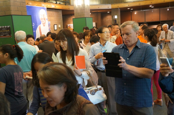 도착하시자마자 시애틀법당 신도님들이 정성스럽게 준비한 호박죽으로 간단하게 식사를 하시고 바로 첫강연이 시작하는 강연장으로 이동하여 행사준비하고 있는 자원봉사자들과 참가자들에게 인사를 하였습니다. 멀리서 부터 ‘내가 세상의 희망입니다’라는 주황색 티셔츠를 보니 반갑기 그지 없었습니다. 오늘은 미국 노동절 연휴 마지막날이라 사람들이 적게 올거라고 예상을 했지만, 시간이 지남에 따라 빈자리가 차고 있었습니다.