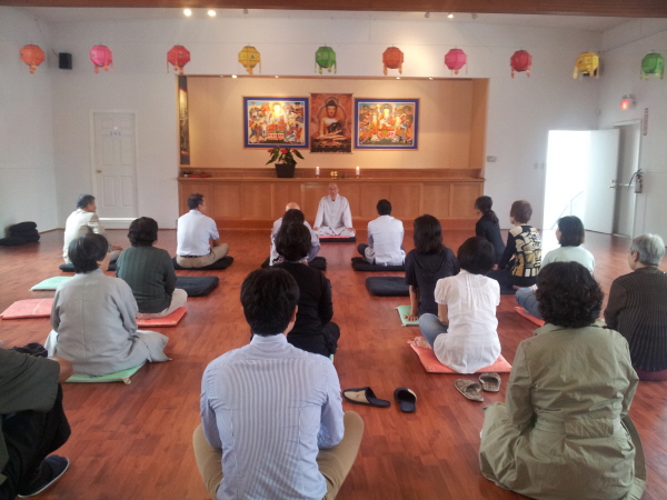 그동안 시애틀에 왔을 때는 날씨가 화창하였는데 새벽부터 비가 와서 그런지 날씨가 쌀쌀하여 스님께서도 감기기운이 있으신 것 같았습니다. 국경을 통과하여 12시 20분경에 벤쿠버 근교 벤쿠버 정토법당이 있는 Surrey 지역에 도착하였습니다. 법당에 도착하니 총무님과 신도님들이 반갑게 인사를 하였습니다. 스님께서 법당에 가서 참배를 하고 기다리고 계시던 신도님들이 스님께 삼배로 인사를 드렸습니다. 스님께서 지난 6월에 이어서 9월에 또다시 강연을 준비한다고 수고가 많으시다고 격려를 하시고, 바로 아래층 식당으로 가서 신도님들이 정성스럽게 준비한 음식으로 맛있는 점심식사를 하였습니다.
