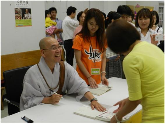 행사를 마차자 스님의 친구분이 오셔서 반갑게 인사를 하였고 또 많은 분들이 스님과 인사를 나누고 사진촬영도 하였습니다. 또한 준비한 책이 거의 다 팔릴 정도로 많은 분들이 책을 구입하여 스님께서는 책을 구입하신 분들께 일일이 사인도 해주시고 또 이번 행사를 위해 기꺼이 성당을 빌려주신 신부님께 건축헌금에 사용하시라고 헌금을 하였습니다. 또한 신부님, 수녀님, 사무장님과 기념촬영을 하였습니다. 그리고 마지막으로 이번 행사의 자원봉사자들과 4개 대학 연합회 회장 및 학생들에게 고맙다고 인사하고 격려를 해주었습니다. 이렇게 뒷정리를 함께 하고 숙소로 돌아가는 도중에 법회가 열리는 있는 법회장소로 갔는데 법회장소는 열린법회에 나오고 있는 거사님의 태권도장의 한쪽 사무실에서 법회를 열고 있다고 하였습니다. 태권도장에 들어서니 아이들이 스님께 드린다고 예쁜 카드를 만들어서 스님을 그려놓고 법륜스님 사랑합니다 라고 적어놓았습니다. 그리고 처음으로 스님과 마주하니 모두들 스님께 삼배로 인사를 드렸습니다.