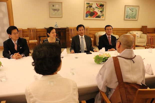 대사님은 “인터넷으로 스님의 세계 100회 강연 소식을 많이 읽어보았다”고 하시면서 스님께 세계 100회 강연을 다니게 된 계기와 미국에서 외국인 강연도 많이 하셨는데 외국인들은 주로 어떤 질문을 하는지 등을 물어보셨습니다. 스님께서는 이번 세계 100회 강연을 다니며 일어났던 다양한 에피소드들을 말씀해 주셔서 모두들 관심있게 경청했습니다. 대사님은 스님의 115회 연속 강연에 대해 무척 놀라워하시면서 스님께서 마지막까지 무사히 강연을 마칠 수 있기를 기원해 주셨습니다.