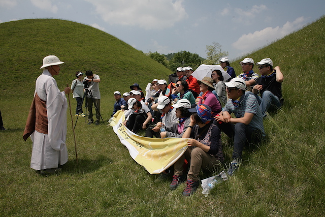어제 두북에서 하룻밤을 머무신 스님께서는 오전11시 무렵 법흥왕릉에 먼저 도착해 평화리더십아카데미(이하 평리아) 수강생들을 환한 미소로 맞이해 주셨습니다. 지난 4월에는 정토불교대학, 경전반, 청년정토회 등 최소 300여명이 넘는 대중들에게 매주 경주 역사기행을 안내하셨는데, 오늘은 조촐하게 23명을 대상으로 안내를 하는 날입니다. 비록 인원은 적었지만 스님의 설명은 한결같이 정성과 열정이 깃들어 있었습니다.