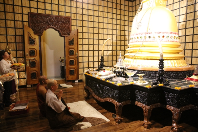 스님이 불상 앞에서 삼배를 하자 수보디 스님은 간단히 불상에 대해 소개를 해준 후 아직 공개가 되지 않은 특별한 곳으로 스님을 안내했습니다. 엘리베이터를 타고 올라가자 작은 방 안에 금빛으로 장식된 사리탑이 안치되어 있었습니다. 스님은 이곳은 “아직 재가자들에게는 공개되지 않는 곳”이라고 하면서 “법륜 스님 일행에게만 오늘 특별히 보여주는 것”이라고 말해 주었습니다. 스님은 사리탑 앞에서 합장을 하고 축원 기도를 해주었습니다.