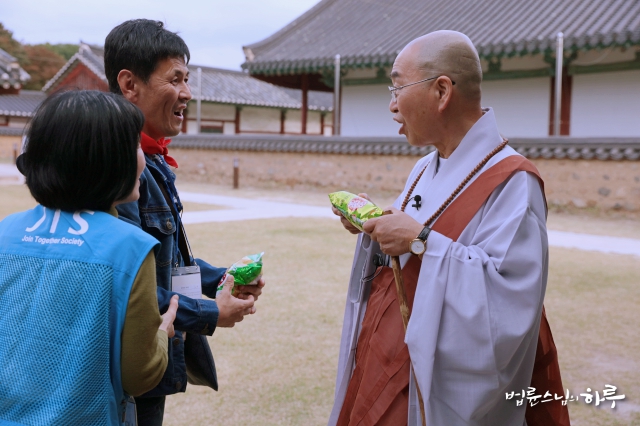 가을 풍경 속 스님과 거주인, 봉사자들이 아름답습니다. 한 거주인이 다가와 스님에게 자유시간을 내밉니다.