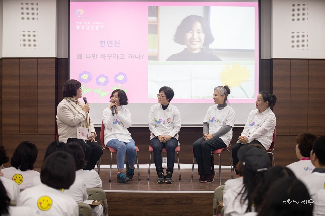 오후 첫 프로그램은 ‘행복 톡톡’입니다. 먼저 행복시민 과정을 하며 바뀐 삶의 이야기를 나누었습니다. 네 사람이 무대에 올랐습니다. 한 분은 남편과의 갈등을 극복한 사례를 이야기했습니다.