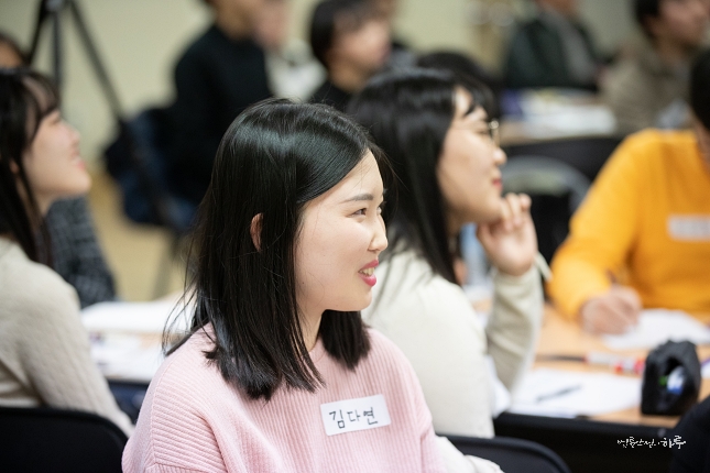 강연을 하기 전 처음 만난 어색함을 푸는 시간을 가졌습니다. 조별로 둘러앉아 얼굴만 보고 전공을 맞춰보는 놀이도 해보고, ‘세상을 어떻게 바라보면 좋을까?’에 대해 가볍게 의견을 나누었습니다. 대학생들은 어색한 웃음 속에서 조금씩 가까워졌습니다.