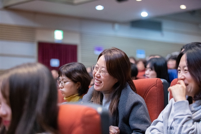 “자리가 없어서 돌아가시는 분들이 많다고 하네요. 다른 곳이면 계단에 앉고 하는데 예술회관이라서 정원 외 입장이 일절 안 된다고 합니다. 질문을 하겠다고 신청한 분도 17명이네요. 2시간 동안 많이 해야 10명인데, 질문을 못하는 분들이 있더라도 양해를 해주시기 바랍니다. 오늘 돈 내고 여기 들어온 사람은 없잖아요.” (모두 웃음)
