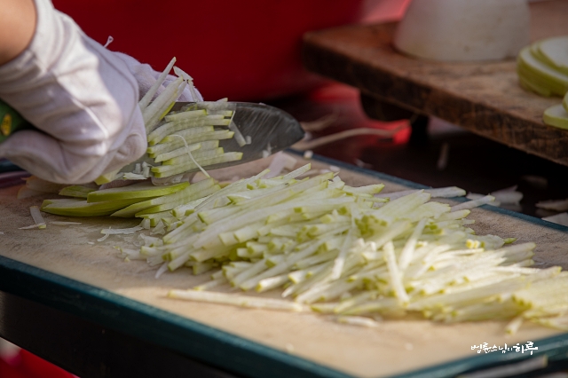 오후 내내 썰고 썰어 무, 미나리, 갓을 다 썰었습니다. 채 썰기를 마치고 사용한 고무장갑, 도마, 칼도 씻어 종류별로 선반 아래에 잘 정리해두었습니다.
