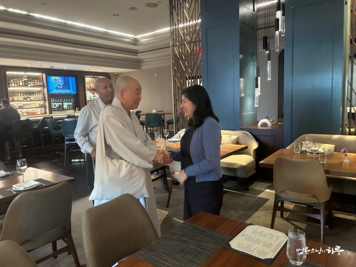 이에 대해 니나 소여 님은 트럼프 대통령도 같은 말을 한 적이 있다고 화답했고, 스님은 비록 트럼프 대통령이 국내 문제에 많은 혼란을 일으키고 있긴 하지만 평화에 대한 진전된 관점만큼은 높이 평가할 만하다고 이야기했습니다. 대화를 마치고 스님의 책을 선물한 후 미주 정토회관으로 출발했습니다.