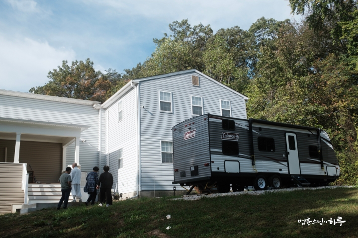 두루 점검을 마친 후에 이번 북미 강연과 워싱턴 D.C. 일정을 총괄하고 지원한 법해 법사님, 민덕홍 님과 함께 회관 앞에서 기념사진을 촬영했습니다.