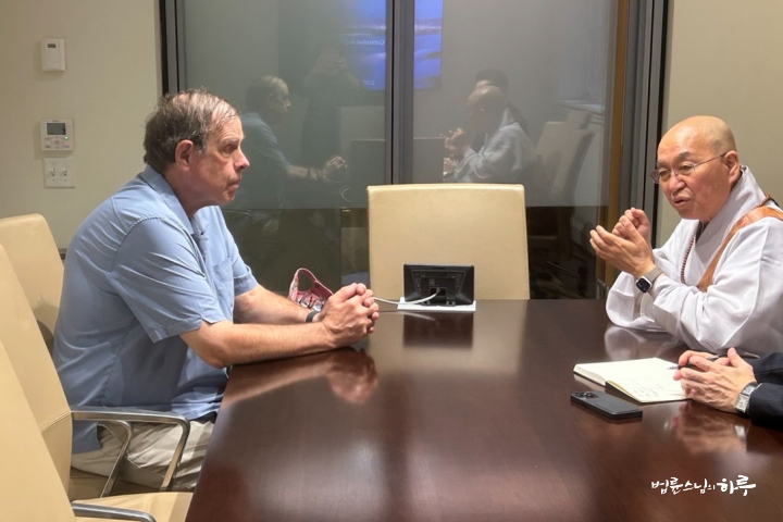 대화를 마치고 스님이 감사의 뜻을 담아 영어로 번역한 저서를 선물하면서 “이것이 제 본래 직무입니다.”라고 말하자 박사님은 환하게 웃으며 기뻐했습니다.