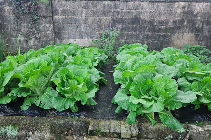 오후 4시가 넘어 자리에서 일어난 스님은 작업복을 입고 텃밭으로 향했습니다. 한 달 전에 심어 놓은 배추가 아주 잘 자라 있었습니다.