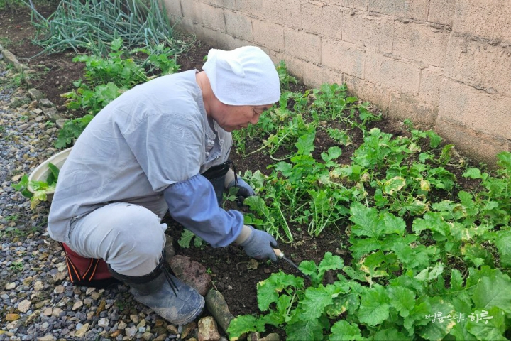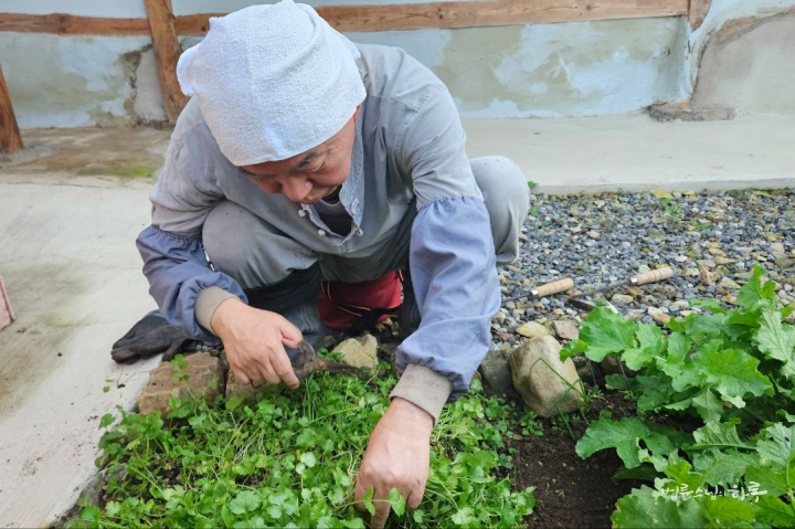 무밭으로 가보았습니다. 연일 잦은 비로 인해서 무에는 무름병이 왔습니다. 스님은 병든 곁가지를 정리하면서 잡초를 뽑고, 무밭을 깔끔하게 정리했습니다.