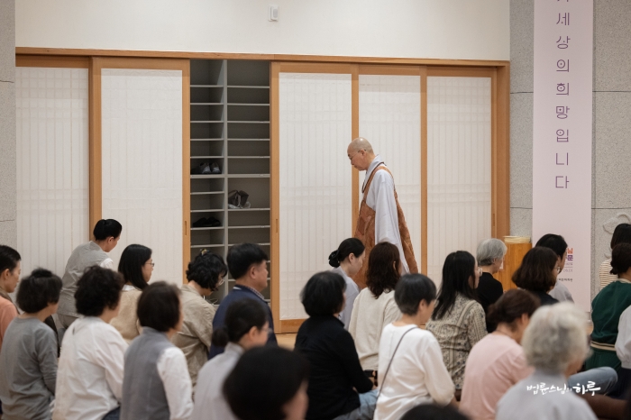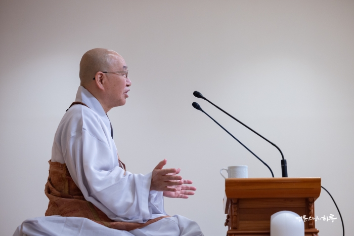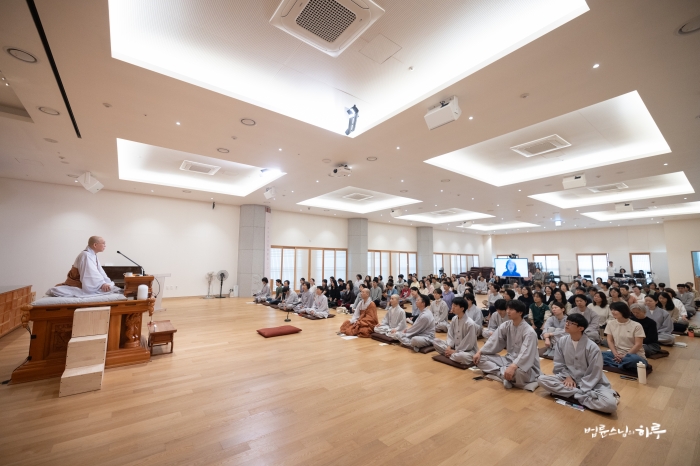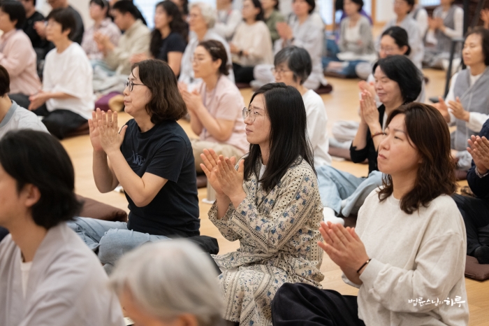 큰 박수로 서로의 활동을 격려한 후 다 함께 삼배의 예로 스님에게 법문을 청했습니다. 스님은 지금처럼 혼란스러운 시대일수록 과거의 인식 틀을 내려놓고 새로운 시각으로 세상을 바라봐야 한다고 강조하며 법문을 시작했습니다.