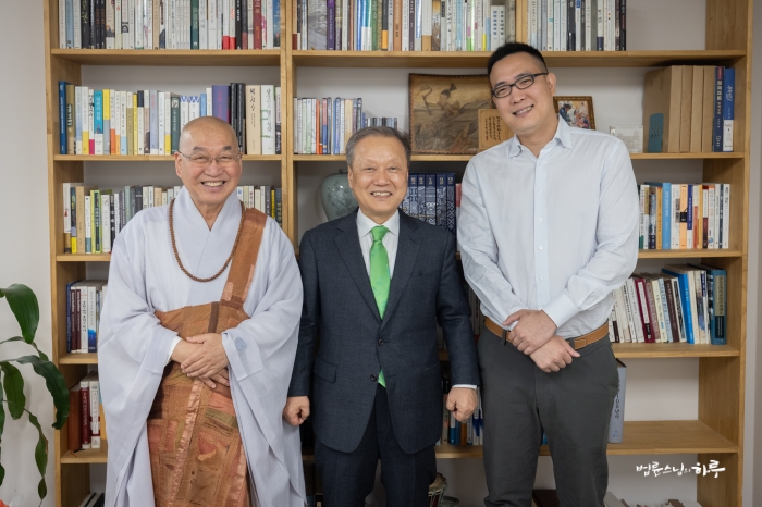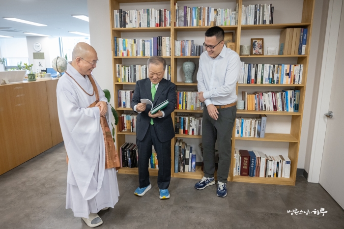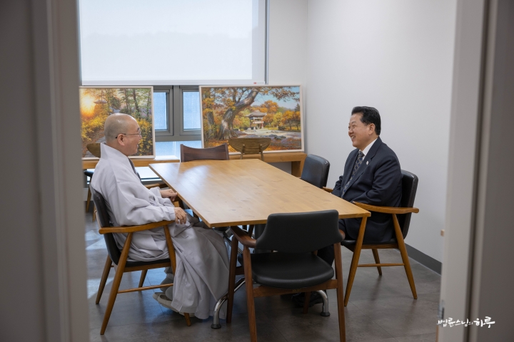 3층 설법전을 나온 스님은 평화재단을 찾아온 손님을 맞이했습니다. 더불어민주당 김병주 국회 의원을 만나 점심 식사를 함께 한 후 차담을 나누었습니다. 안보 분야의 위기관리 방안에 대해 많은 대화를 나누었습니다.