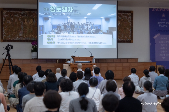 먼저 지난 한 주 동안 정토행자들의 활동 모습을 영상으로 보았습니다. 북미 동부 지역 순회강연, 청년 페스타 홍보, JTS 복지사업, 에코붓다 옷 안 사 입기 챌린지 등 일주일 동안 국내외에서 다양한 활동들이 펼쳐졌습니다.