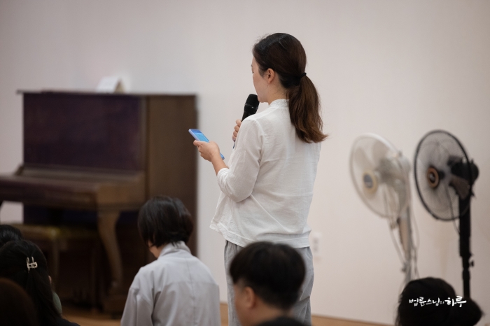 이어서 사전에 질문을 신청한 분들이 차례대로 질문을 했습니다. 현장에서 두 명, 온라인에서 한 명이 각각 질문하고 스님과 대화를 나누었습니다. 그중 한 명은 교통사고 이후 만성 통증으로 인해 일상과 마음이 모두 무너진 자신을 어떻게 회복할 수 있을지 스님에게 조언을 구했습니다.