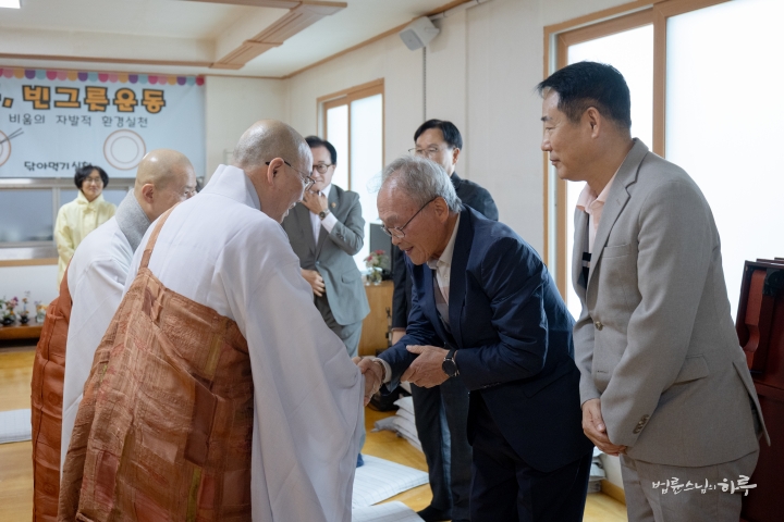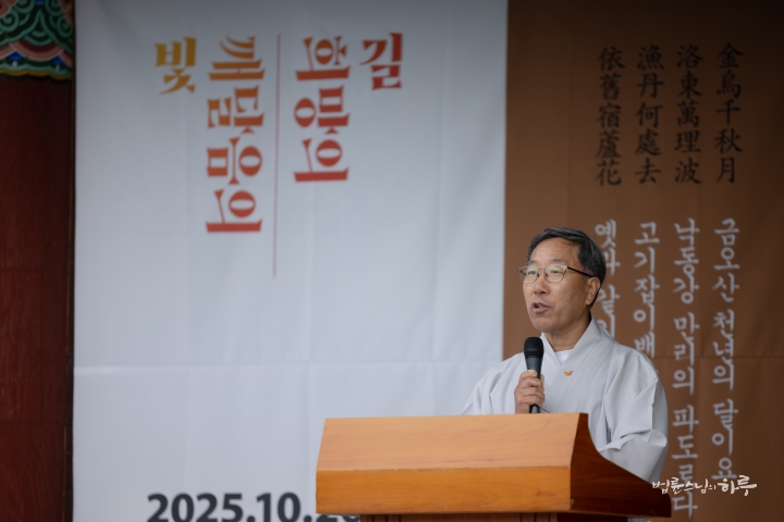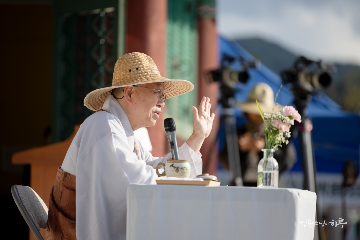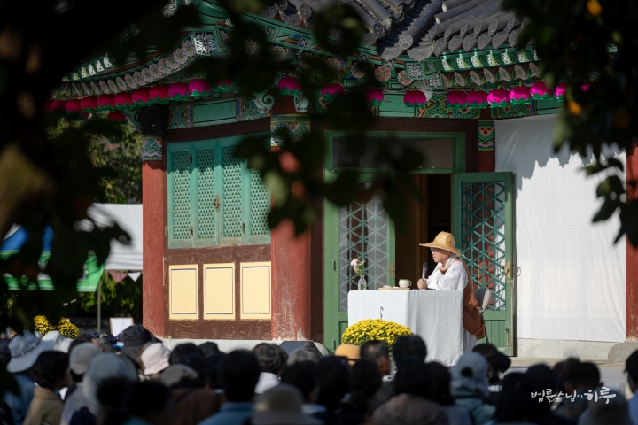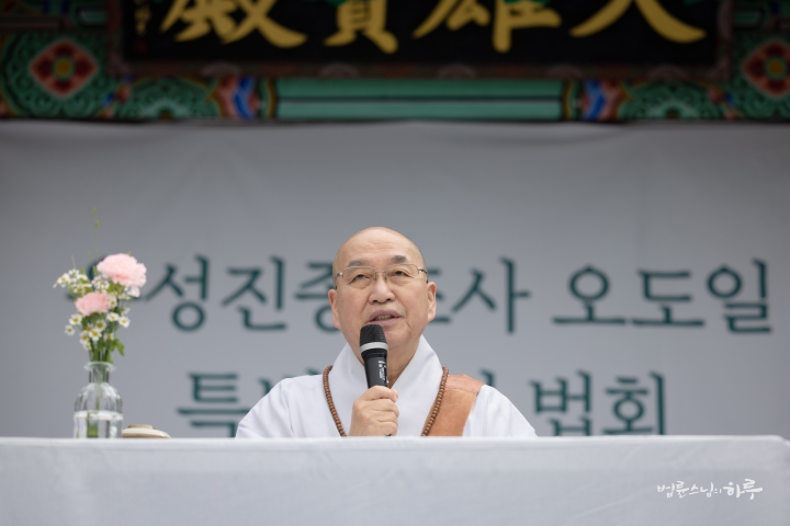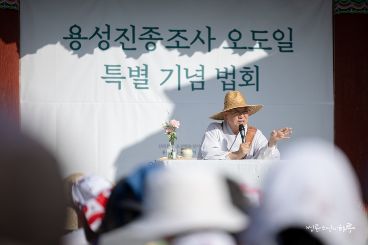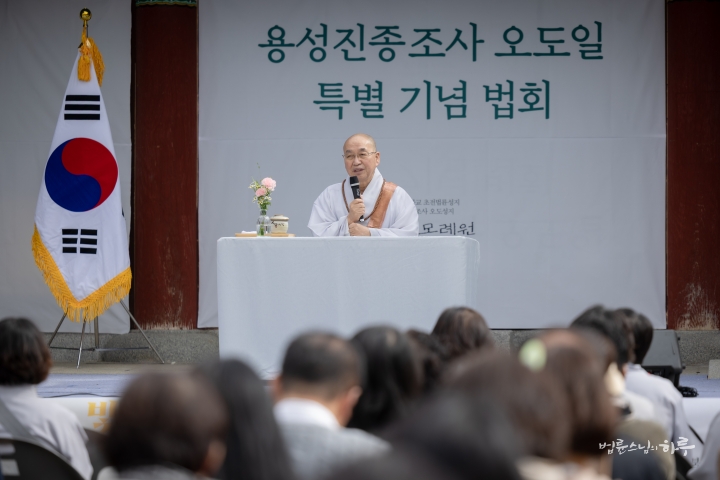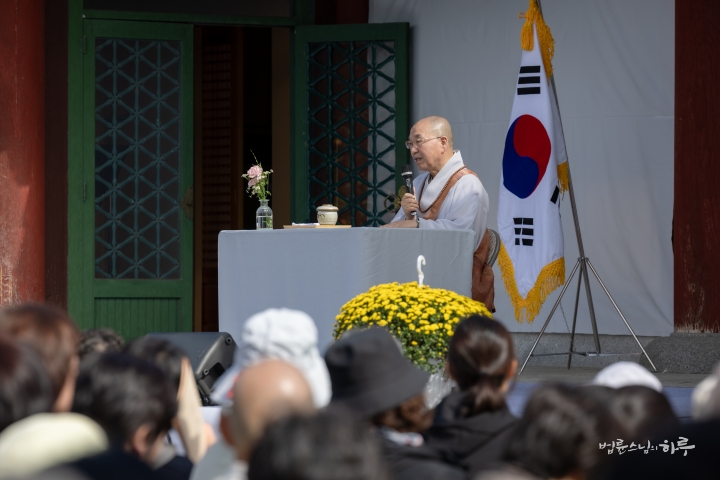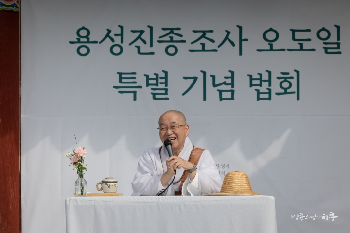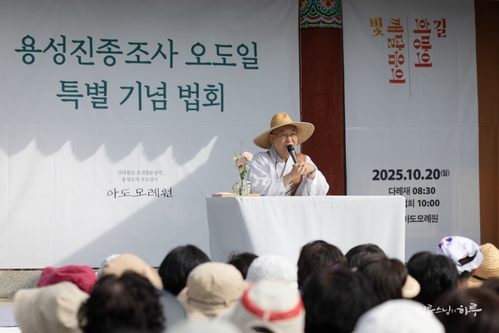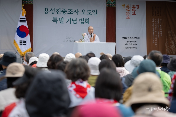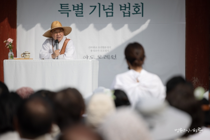 다음은 법륜 스님이 용성조사 오도일을 기념하여 “깨달음의 빛, 희망의 길”이라는 주제로 기념 법문을 해주었습니다. 스님은 기념행사가 열리는 이곳 아도모례원의 역사적 의미에 관해 이야기를 해주었습니다.
