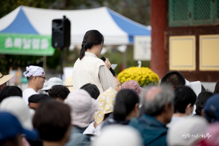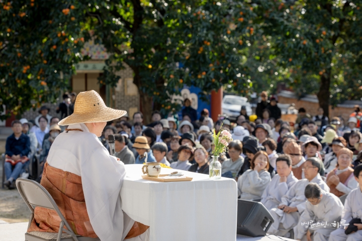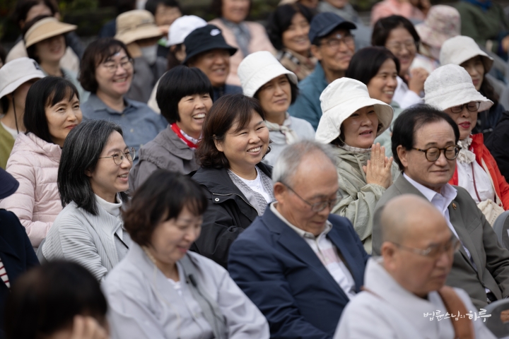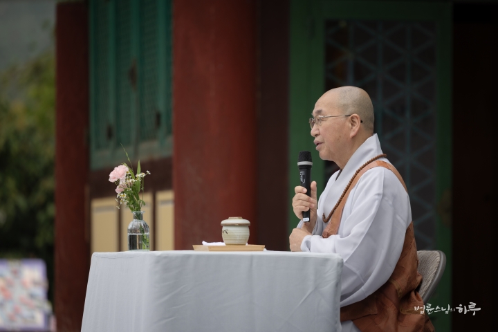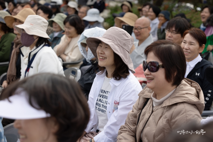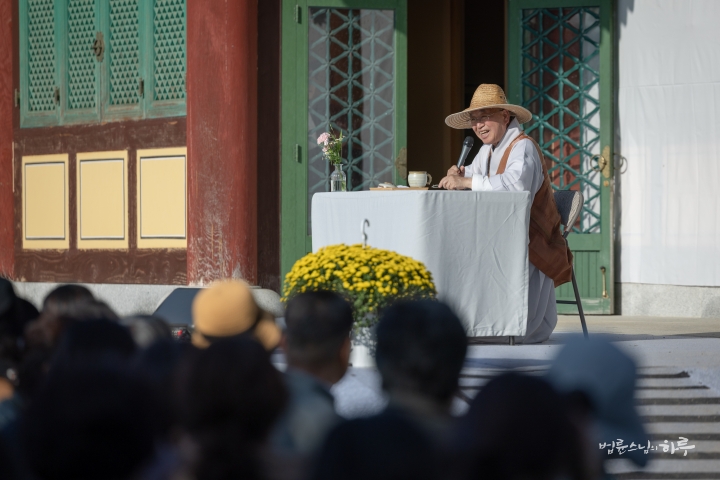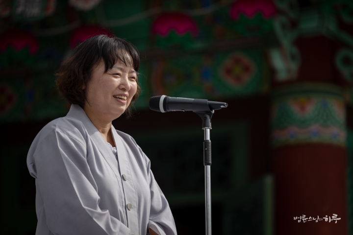 웃음과 박수를 뒤로하고 스님이 연단에 올라와 대화를 이어나갔습니다. 환한 웃음과 함께 스님이 인사말을 했습니다.