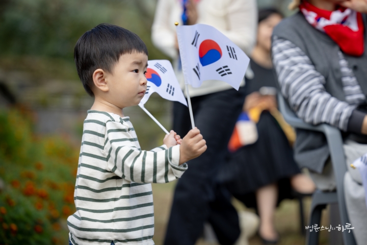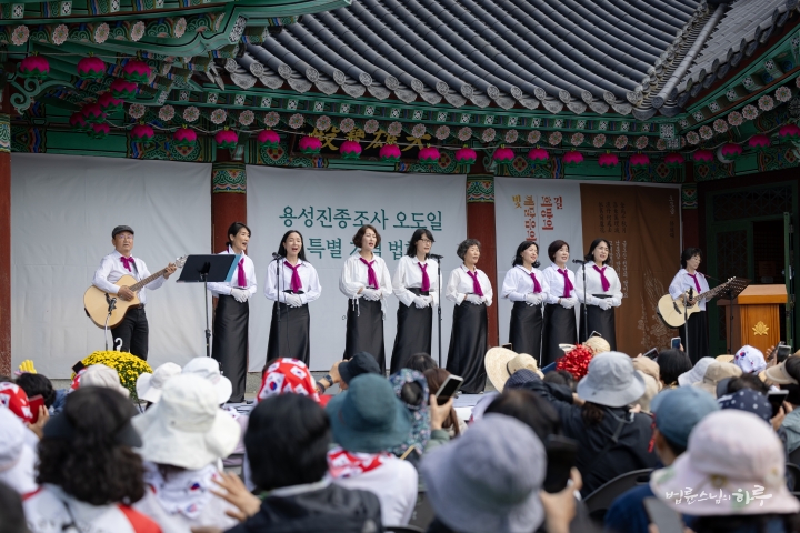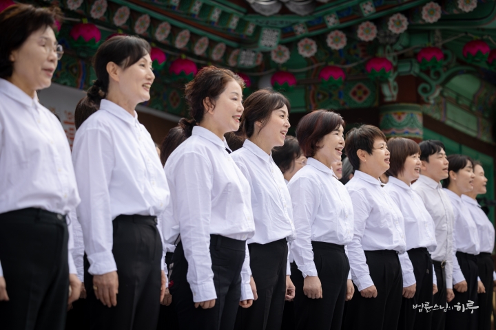 이어서 온겨레의 노래를 다 함께 불렀습니다. 용성진종조사께서 작사하시고 불심도문 큰스님께서 정리하신 곡입니다. 민족 대표 33인을 상징하는 33인의 대구경북지부 합창단의 선창에 따라 다 함께 3절까지 힘차게 불렀습니다.