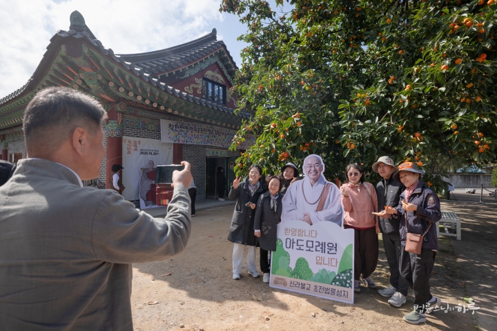 고속도로 위를 1시간 30분 동안 달려 9시 30분에 아도모례원에 도착했습니다. 곳곳에 많은 봉사자들이 사람들을 맞이하기 위해 바쁘게 움직이고 있었습니다. 스님이 입구에 들어서자, 모두가 열렬히 환영을 해주었습니다.