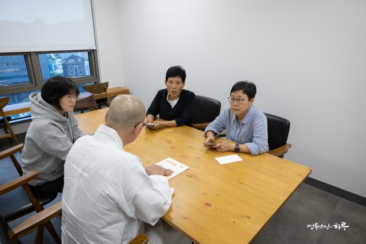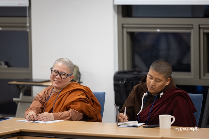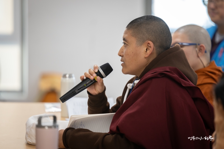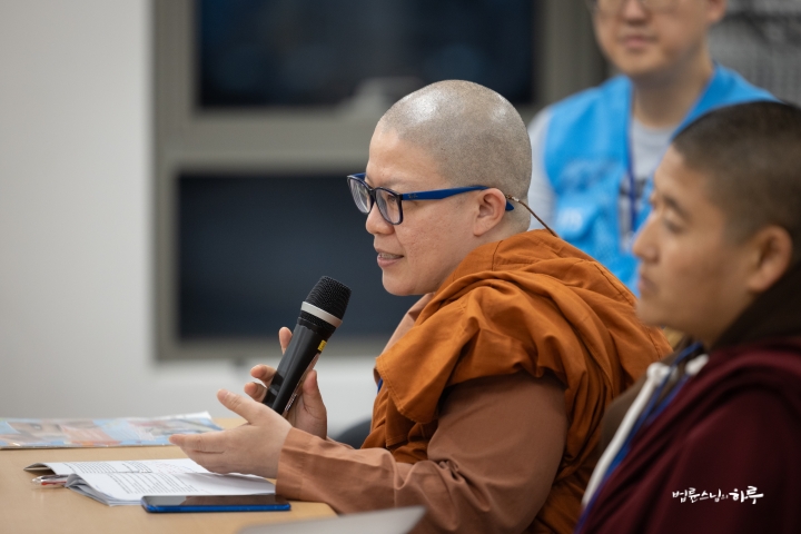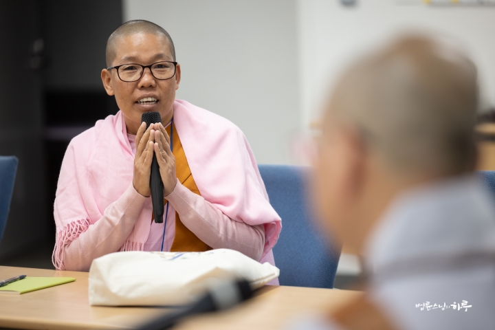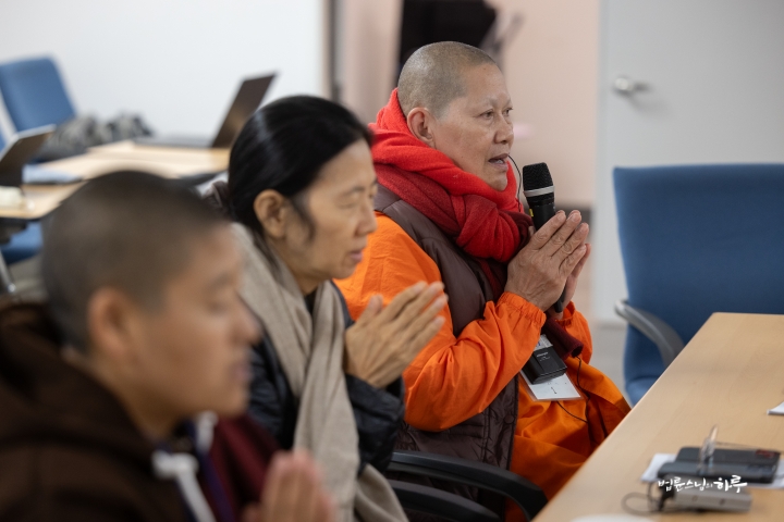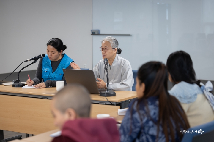 스님은 조용히 앉아 대화하는 내용을 경청하면서 법사님의 답변 중에 보충할 내용이 있으면 설명을 덧붙였습니다.