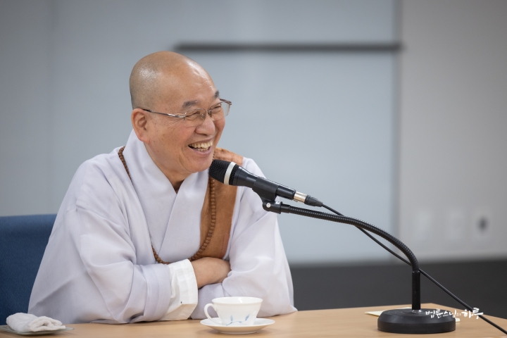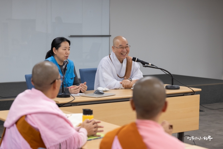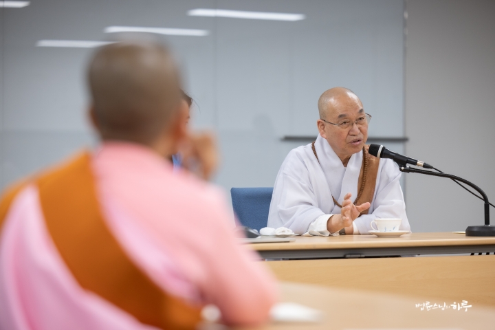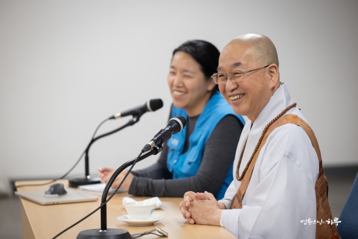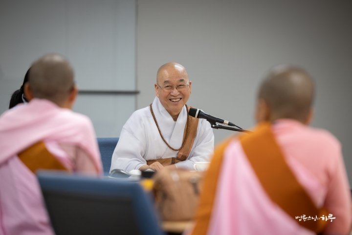 “내일도 대화할 시간이 있고 모레도 대화할 시간이 있으니까, 질문할 것이 있으면 메모해 두었다가 질문하십시오. 정토회 법사님들이 대부분 답을 해주실 테니 거기에서도 해결이 안 되는 것만 저에게 물으면 됩니다. (웃음)