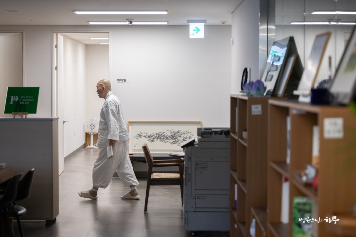 스님은 새벽 수행과 명상을 마친 후 평화재단으로 향했습니다. 아침 7시부터 북한 전문가들과 조찬 모임을 하며 하루 일과를 시작했습니다.