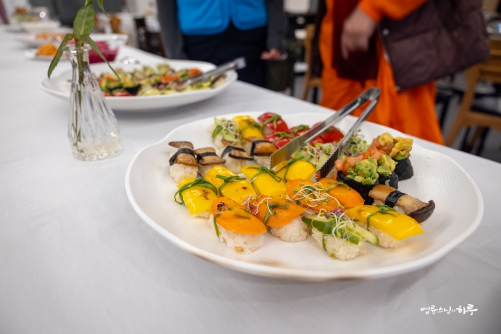 각자 먹을 만큼 음식을 덜어 접시에 담은 뒤, 간단히 감사 기도를 올리고 식사를 시작했습니다.