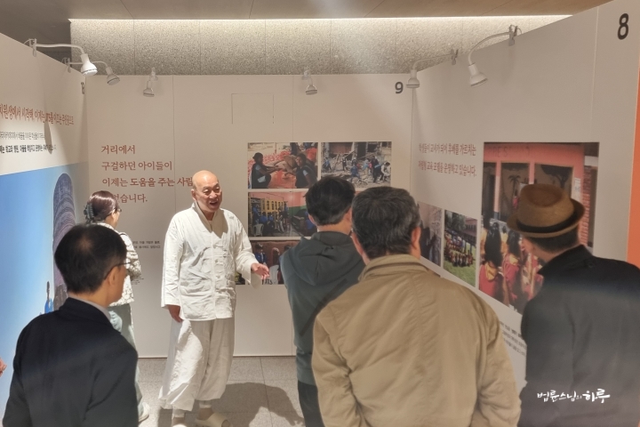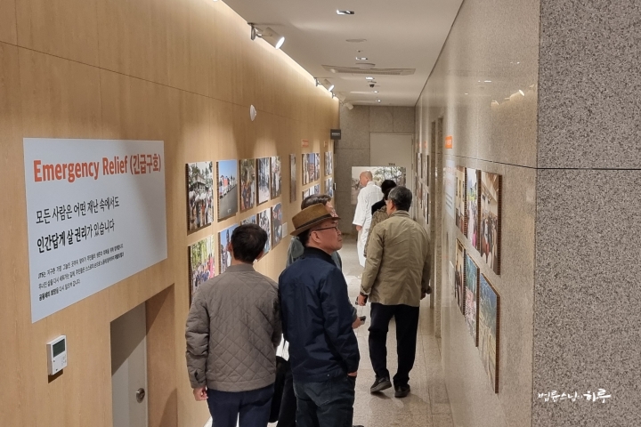 조찬을 마친 후 지하 3층과 2층에서 열리고 있는 JTS 32주년 기념 사진전을 전문가들과 함께 관람했습니다. 스님이 32년 전 인도의 불가촉천민 마을에 수자타 아카데미를 세울 때의 모습부터 북한의 식량난을 접하고 100만 인 서명 운동을 시작할 때의 모습, 막사이사이상을 수상한 것을 계기로 필리핀 민다나오에서 학교를 짓기 시작한 이야기, 세계 곳곳의 재난 현장에서 긴급 구호 활동을 한 모습 등, 사진 속에는 지난 32년간 JTS가 펼쳐온 활동의 흔적이 차분히 담겨 있었습니다. 인도와 필리핀, 북한, 미얀마 등 세계 여러 지역에서 진행해 온 교육과 구호 현장의 모습들이, JTS가 어떤 마음으로 일해 왔는지를 말없이 보여 주고 있었습니다.