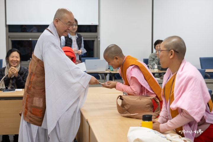 오후 3시 30분부터는 정토회를 견학하러 온 여성 INEB(국제참여불교연대) 참가자들을 만났습니다. 태국, 말레이시아, 미얀마, 라다크, 캄보디아에서 비구니 스님과 여성 활동가 등 10명이 참가했습니다. 반갑게 인사를 나눈 후 스님이 참가자 모두에게 한국에 머무는 동안 쓸 수 있게 용돈을 주었습니다.