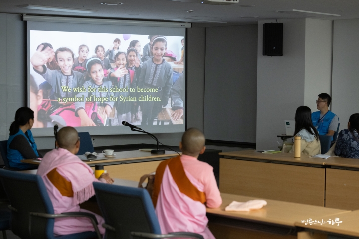 예불을 마친 후 작년에 JTS가 시리아 지진 피해 지역에 학교를 지어준 모습을 영상으로 함께 보았습니다.