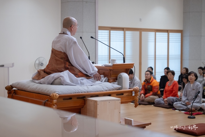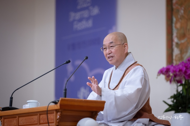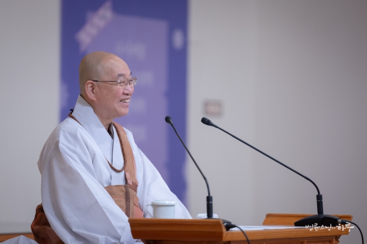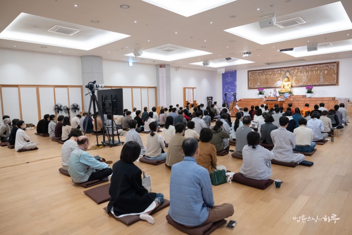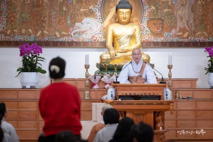 영상이 끝나자, 대중이 삼배의 예를 올리며 스님에게 법문을 청했습니다. 스님은 기후 변화, 인공지능의 발달, 국제 질서의 재편 등 급변하는 세상을 이야기하며 이 속에서 수행자는 어떤 관점을 갖고 살아야 하는지에 대해 법문을 시작했습니다.