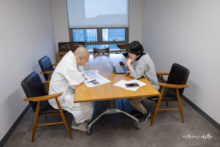 스님은 새벽 수행과 명상을 마친 뒤 평화재단에서 업무를 보다가 수행법회 생방송을 위해 정토사회문화회관 설법전으로 향했습니다.