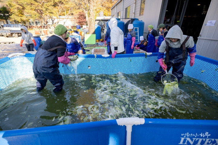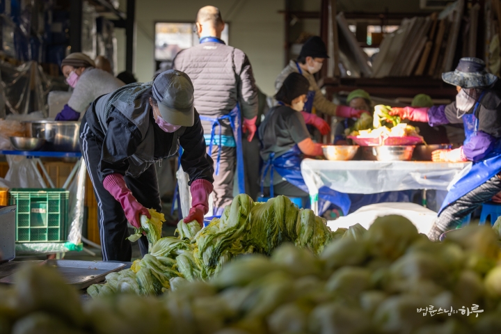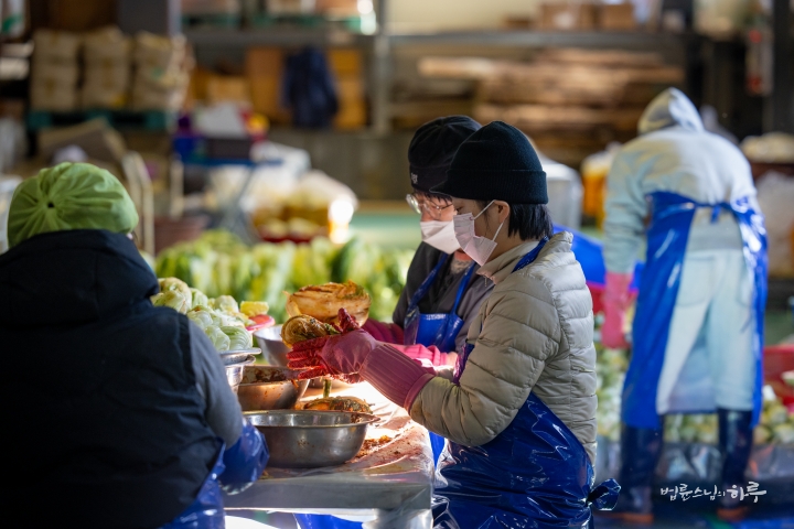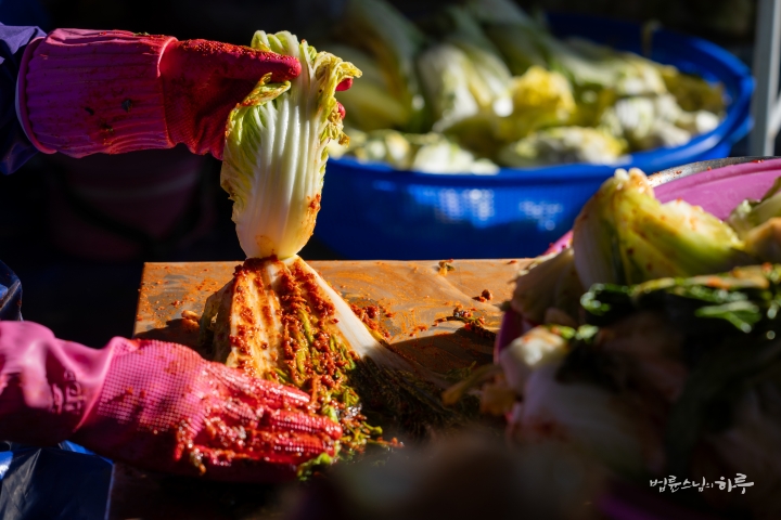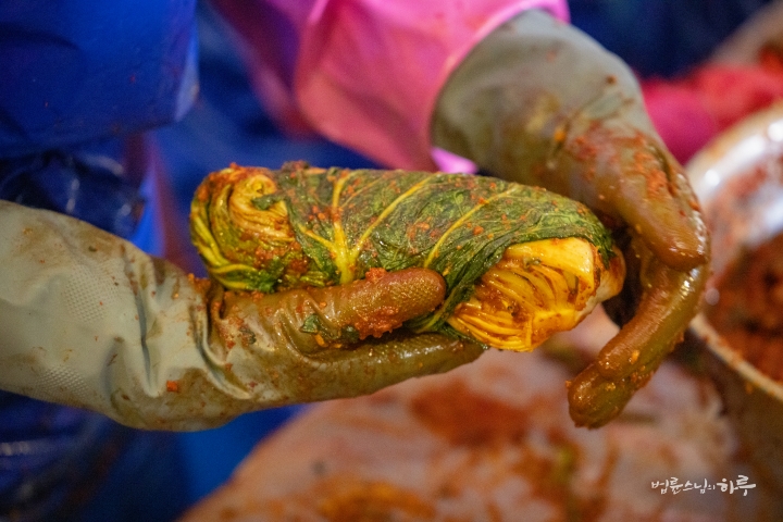 몇몇은 양푼이에 김칫소를 가득 담아서 부지런히 배달했습니다. 치대기를 맡은 행자들은 배추에 김칫소를 이리저리 문질러서 배추 전체에 색이 들게 한 다음 배춧잎 사이사이 다시 김칫소를 채워 넣었습니다. 마지막에는 김칫소가 떨어져 나오지 않도록 겉잎으로 감싸 주었습니다.