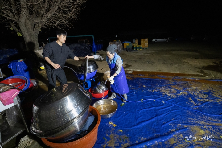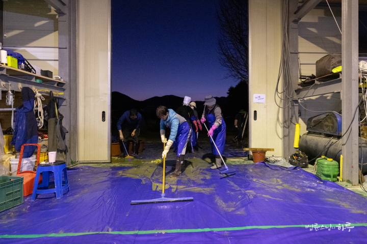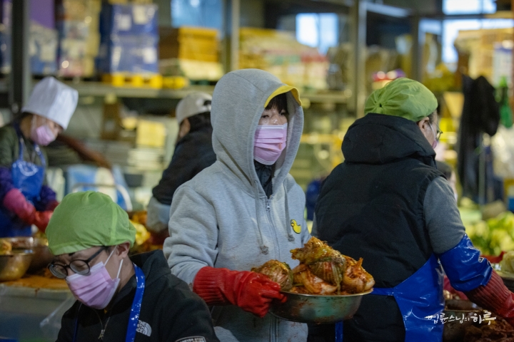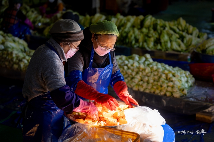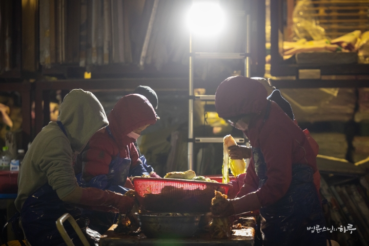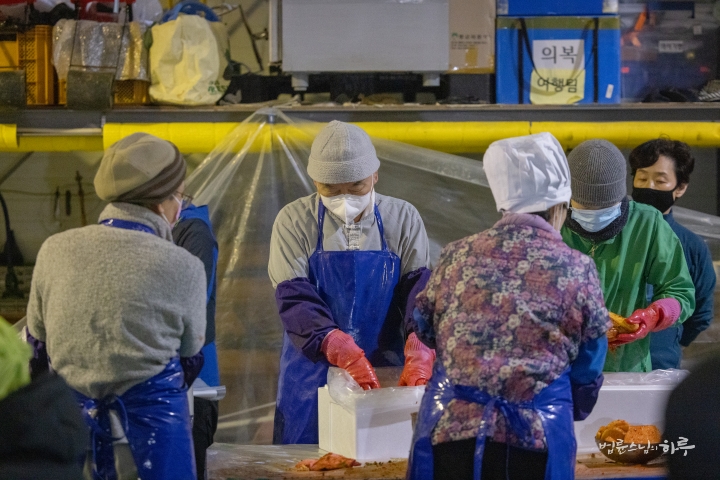 식사를 하며 잠시 몸을 녹인 후 저녁 6시 40분부터 다시 김치 만들기가 시작되었습니다. 야간 작업에 돌입하자 각자의 손놀림이 더욱더 빨라졌습니다.