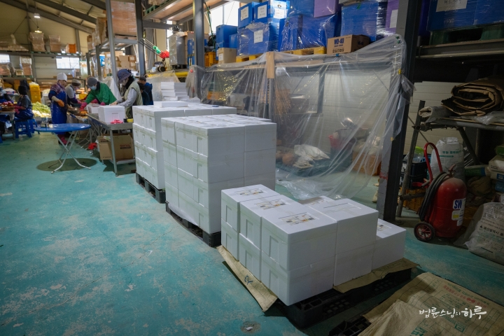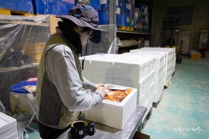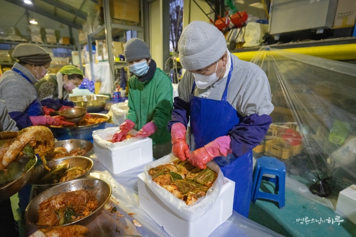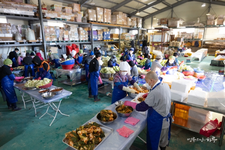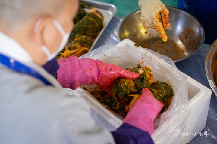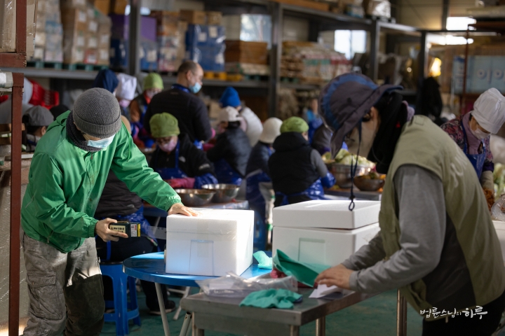 처음에는 서툴러서 시간이 많이 걸렸지만 점점 요령이 생겨서 김치가 빠른 속도로 만들어졌습니다. 스님은 잘 만들어진 김치를 박스에 담는 일을 도맡았습니다.
