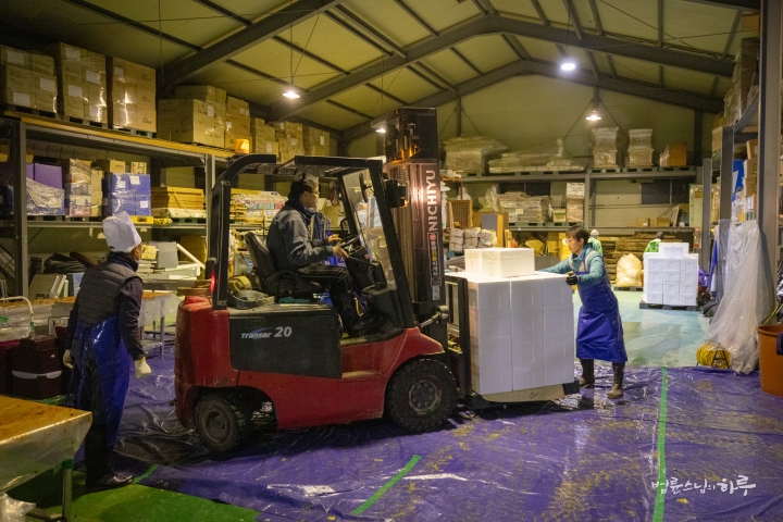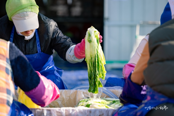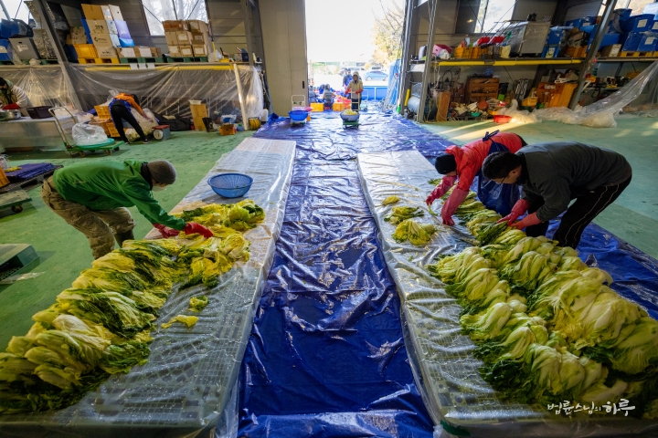 배추가 미끄러져서 물에 퐁당 빠지면 양쪽에서 3단계로 배추를 깨끗이 씻었습니다. 이번 김장 울력에 함께 하고 있는 배우 한효주 님도 배추 씻기 팀에 합류하여 열심히 배추를 씻었습니다. 창고 안에는 깨끗이 씻은 배추가 빠른 속도로 차곡차곡 쌓여 나갔습니다. 경사진 파렛트 위에 쌓은 배추에서는 물기가 계속 빠져나왔습니다.