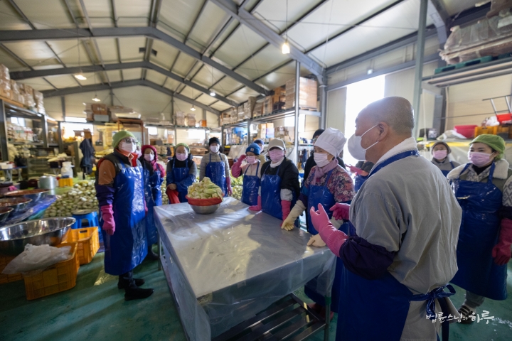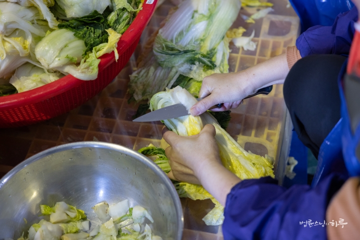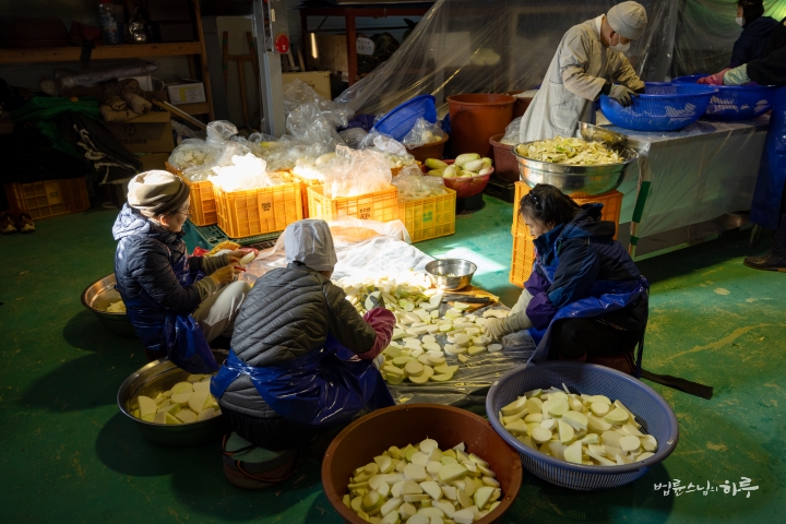 스님은 오전 내내 섞박지 무 만들기 팀에 합류하여 바람 든 무를 골라내고, 새로 무를 써는 작업에 집중했습니다.