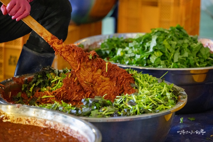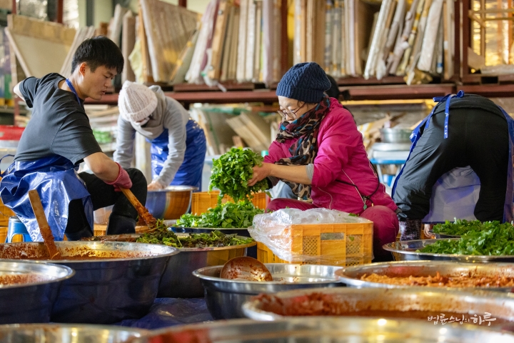창고 한쪽에서는 양념팀이 김칫소를 만들고 있었습니다. 큰 대야에 모든 양념을 넣고 갖가지 채소와 골고루 섞어 김칫소를 부지런히 만들었습니다.