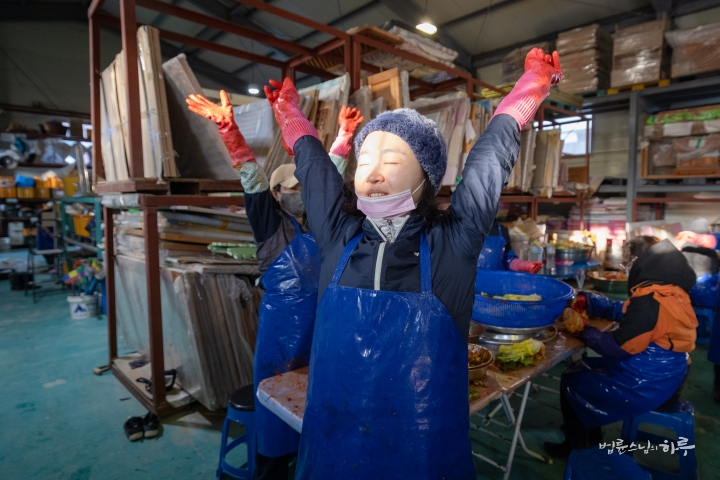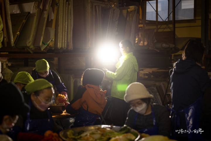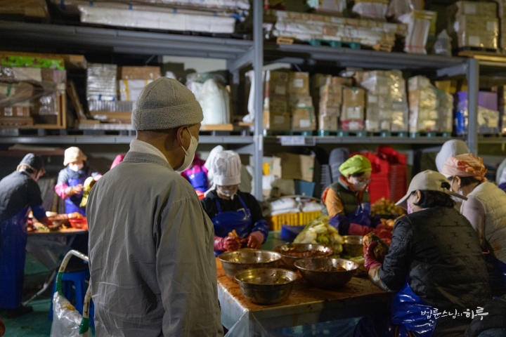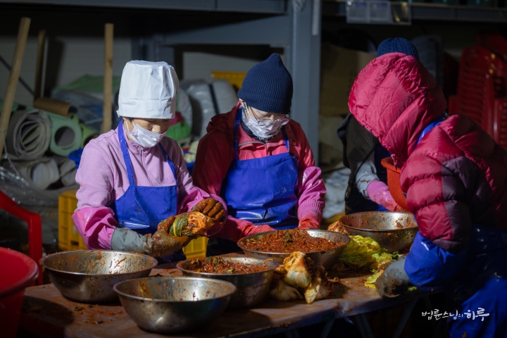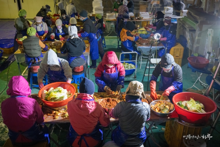 스님의 말씀에 모두 정성을 다해 김치를 치대고, 겉잎으로 곱게 감싸 정갈하게 마무리했습니다. 선물용 박스가 차곡차곡 쌓여 가는 가운데 어느새 해가 완전히 저물었습니다.