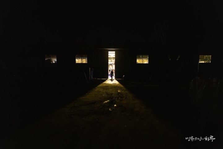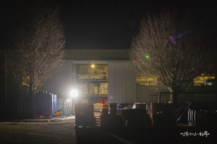 해가 저물어 가자 창고 안이 어둑어둑해졌습니다. 묘당 법사님이 곳곳에 조명을 설치해 주었습니다.