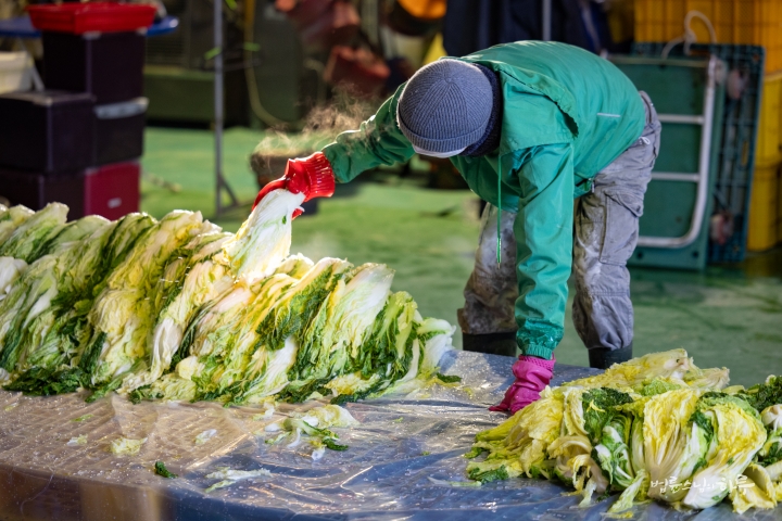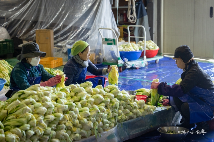 농사팀장의 힘찬 목소리와 함께 김치 공장이 바쁘게 돌아갔습니다.