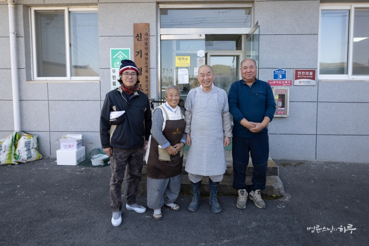 스님은 마을 회관을 나와 식사를 준비해 준 화광 법사님, 봉사자들과 함께 사진을 찍고 다시 김장을 하기 위해 두북수련원으로 향했습니다.