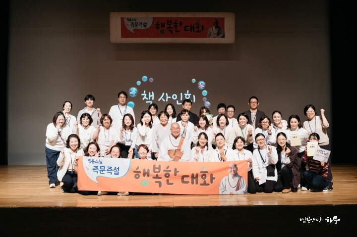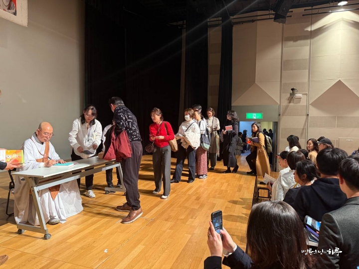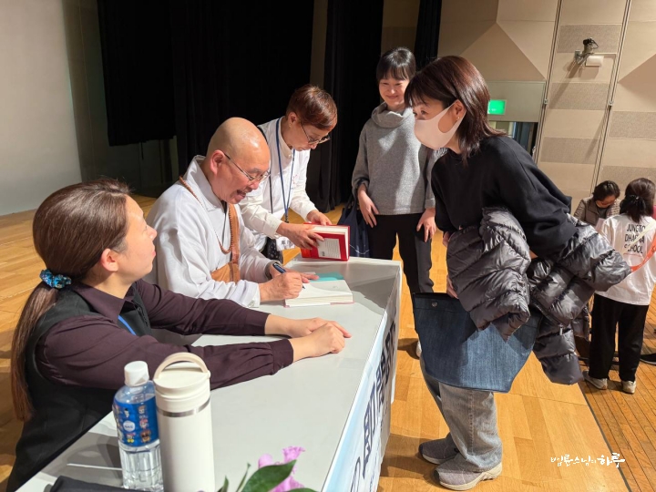 곧바로 무대에서 책 사인회를 했습니다. 참석자들은 일본어로 번역된 스님 책을 한 권씩 들고 줄을 섰습니다. 스님은 한 명씩 눈을 맞추며 인사를 나누었습니다.