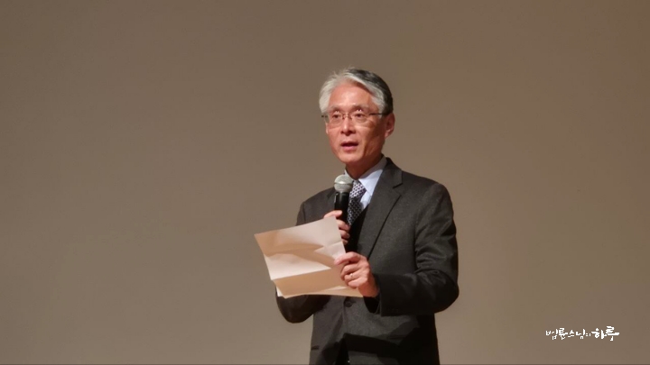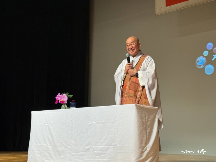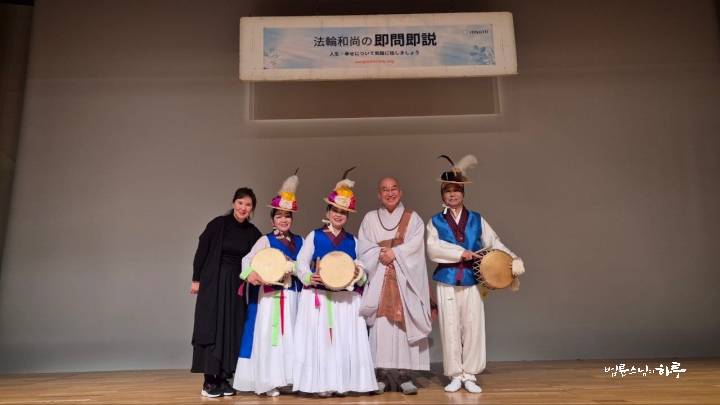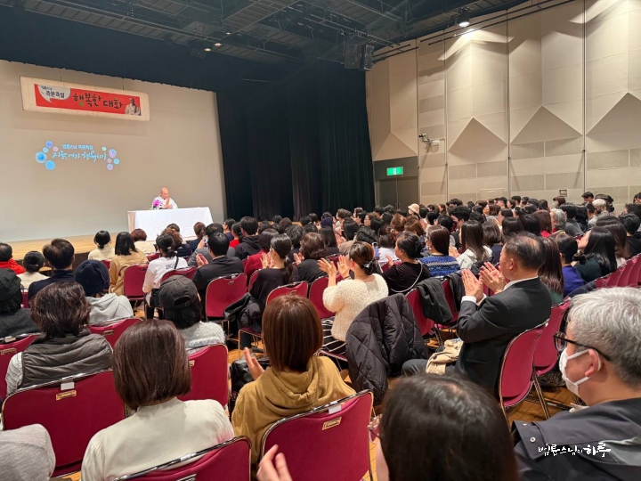 오후 2시가 되자 강연에 앞서 한일 수교 60주년 기념행사를 진행했습니다. 먼저 스님이 한일 수교 60주년을 맞아 기념 축사를 했습니다.