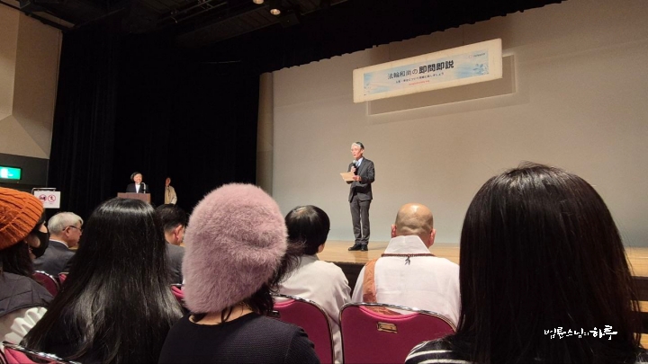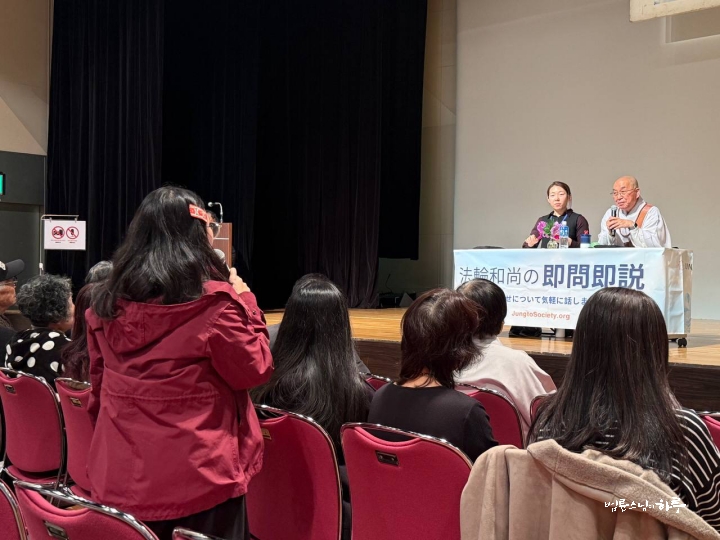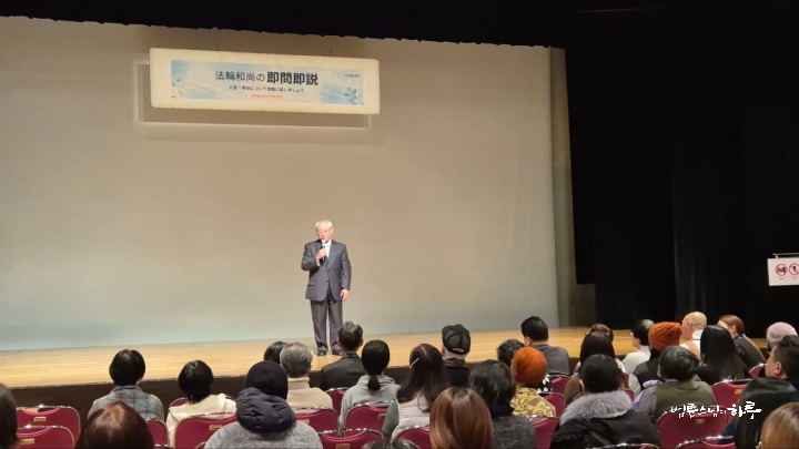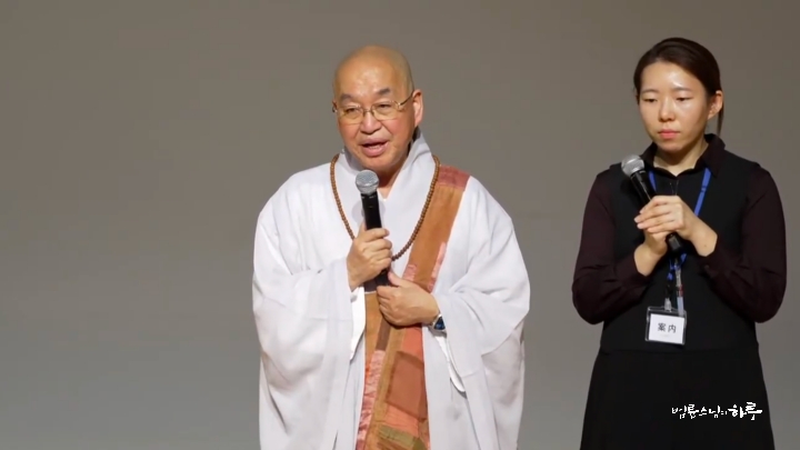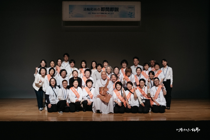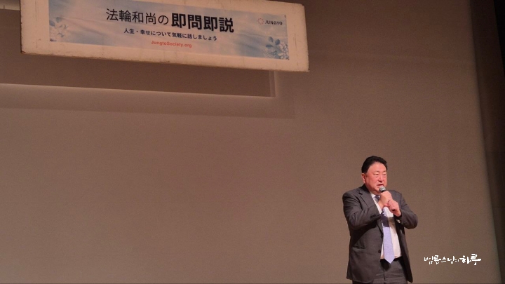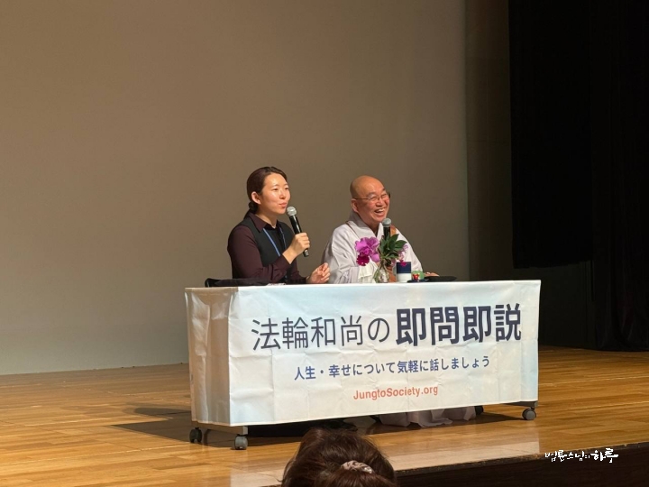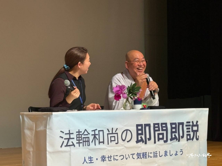 스님을 소개하는 영상을 일본어 자막과 함께 상영한 후 스님이 무대 위로 걸어 나왔습니다. 큰 박수가 쏟아지는 가운데 스님과 통역사가 무대 위에 나란히 앉았습니다. 먼저 스님이 인사말을 하며 대화를 시작했습니다.