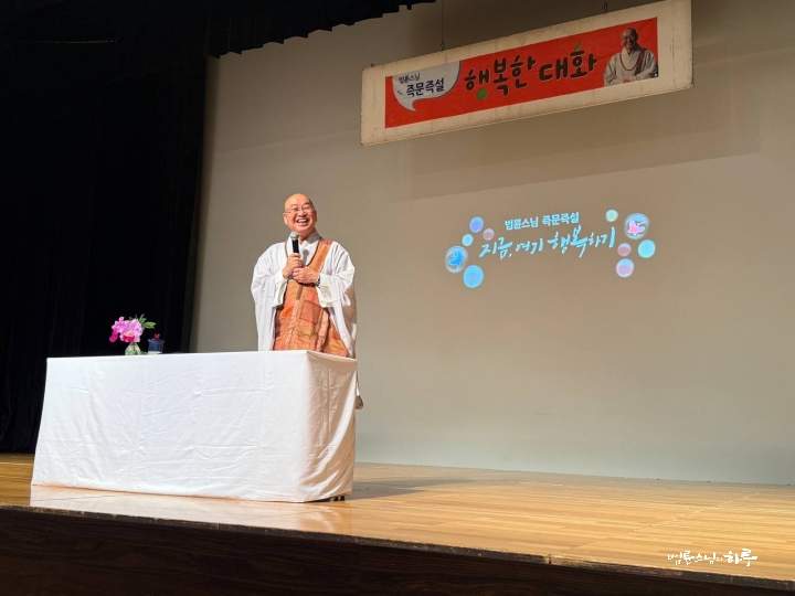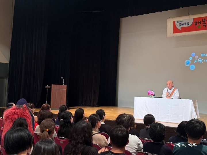 “오늘 우리의 대화 주제는 제가 아니라 여러분이 정합니다. 일반적인 강연은 강사가 주제를 정하지만, 즉문즉설은 청중이 주제를 정합니다. 여러분이 이야기하고 싶은 것은 무엇이든 손을 들고 말씀하시면 됩니다. 주제에는 아무런 제한이 없습니다. 자, 그럼 누구든지 이야기를 꺼내 보세요.”